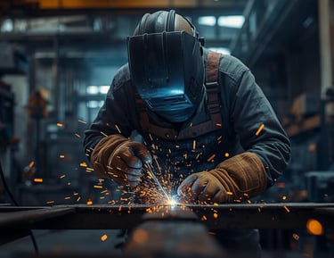 Professional welder performing the assembly and repair of metal parts with precision, while adhering to safety standards and industrial quality requirements.