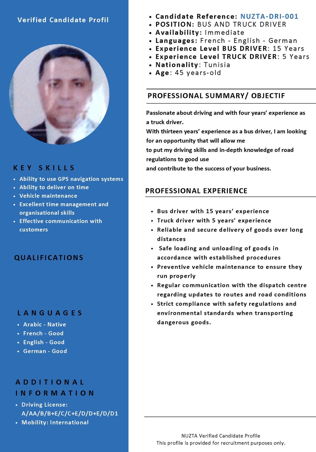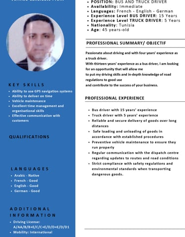 Experienced professional driver with 15 years’ experience driving buses and 5 years in heavy goods transport. Strong expertise in long-distance driving, compliance with road regulations and safety standards. Reliable, punctual and accustomed to working in demanding environments.